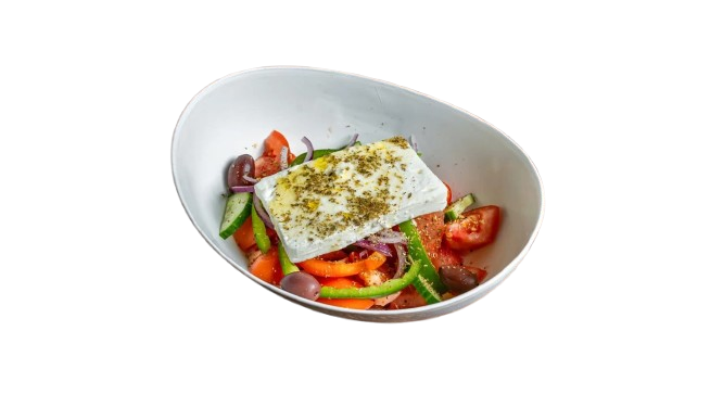 Tomates fraîches, concombre, olives, feta et origan, assaisonnés d’huile d’olive.